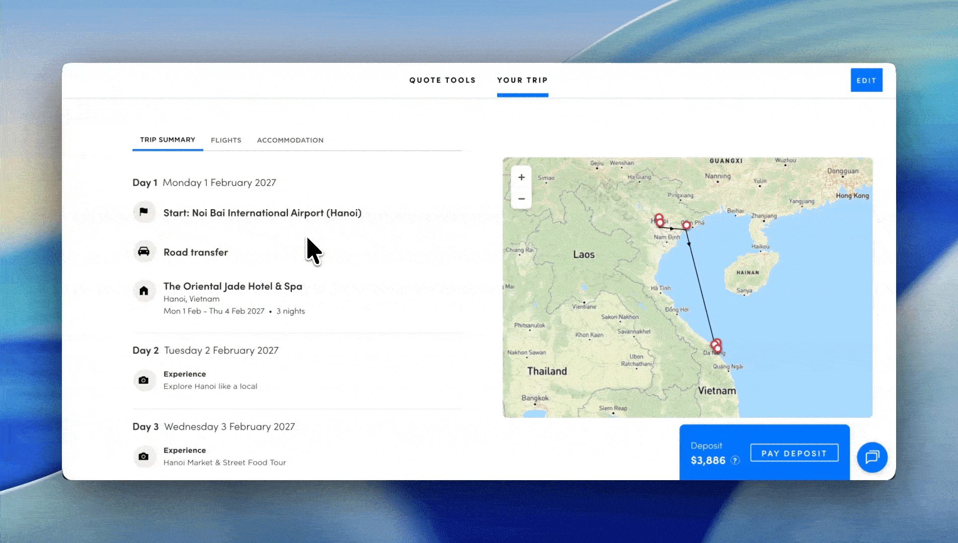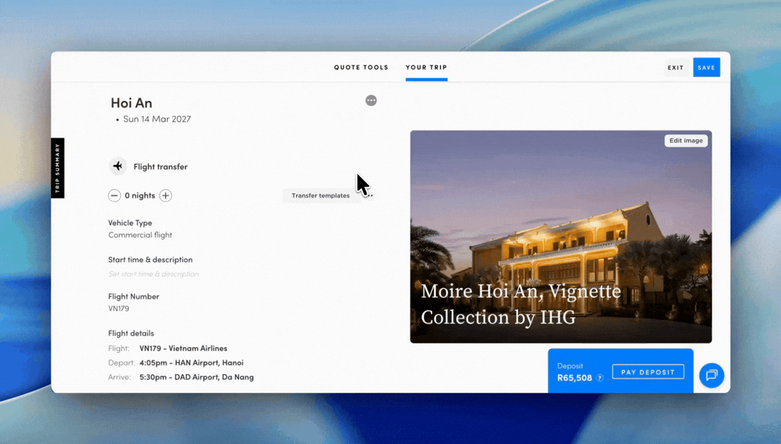 Three new sections are now built into every trip overview: a day-by-day summary, a flight summary (for international flights and internal flight transfers), and accommodation summary. We have also added a tab to the left of the screen which allows for easy navigation through the trip.